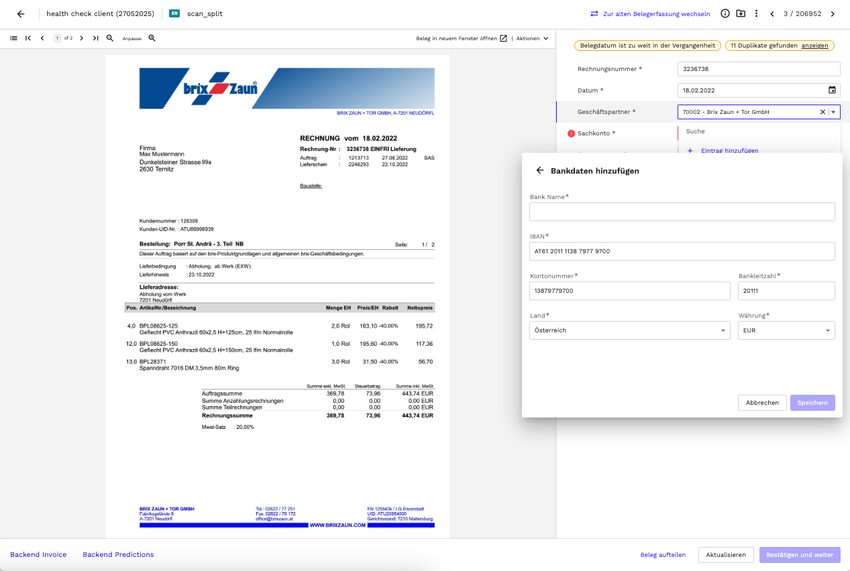 Finmatics now automatically fills all relevant fields when entering a valid IBAN in the Business Partner dialog.