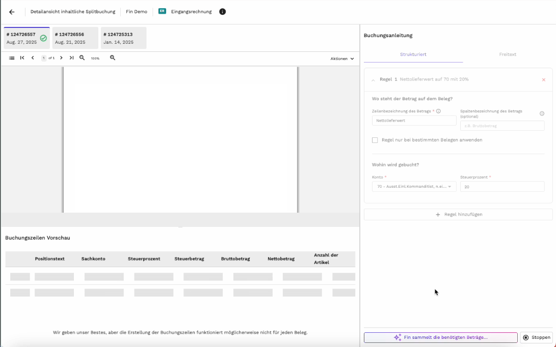 Fin zeigt nun transparent seine einzelnen Schritte, um zu einer inhaltlichen Splitbuchung zu gelangen. So wird besser nachvollziehbar, was im Hintergrund passiert und warum bestimmte Buchungsvorschläge entstehen.